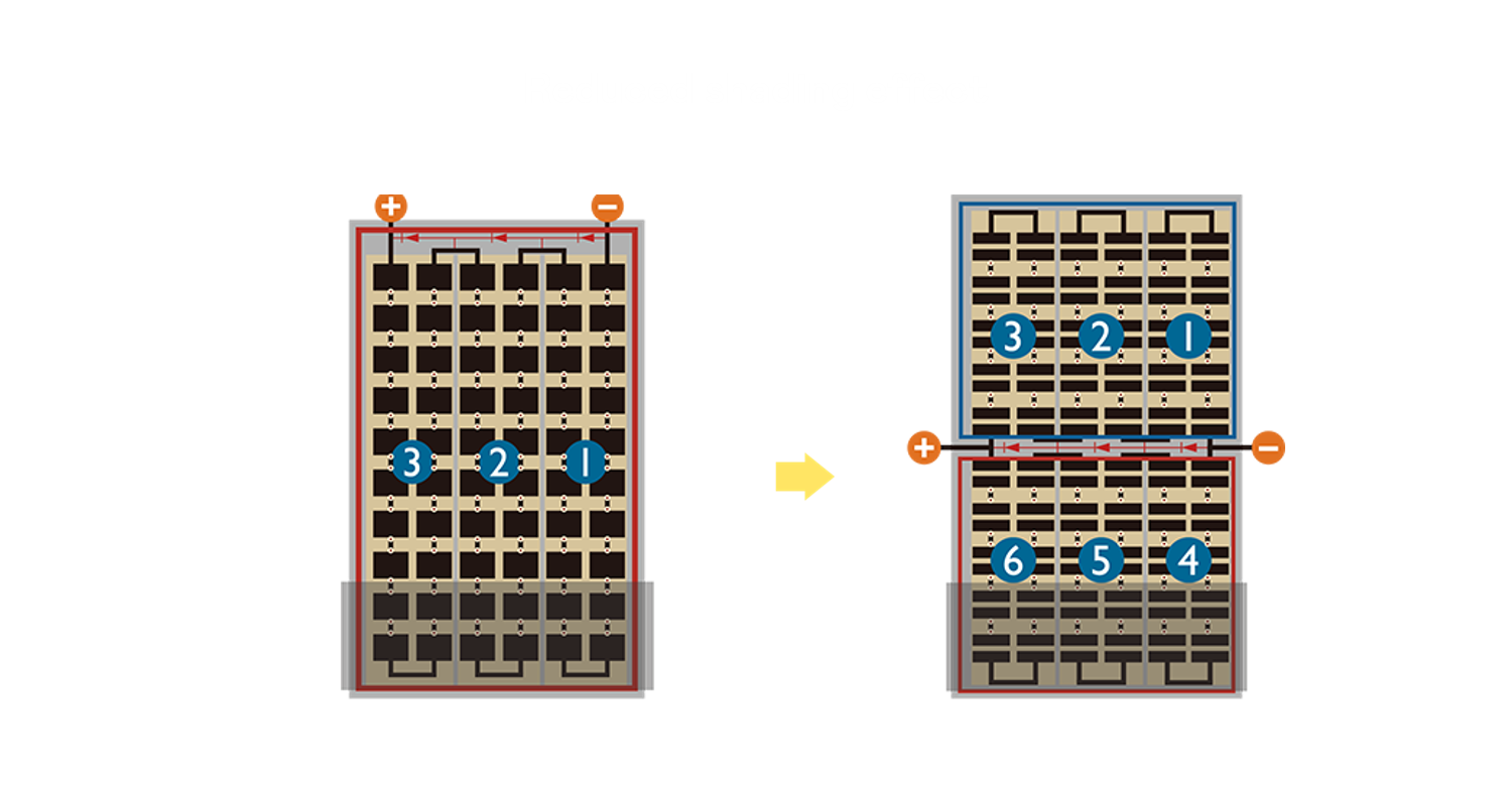 - 結合半切電池,降低遮陰影響、提升模組抗隱裂能力、並減少電阻損耗,進一步提升模組發電效能。